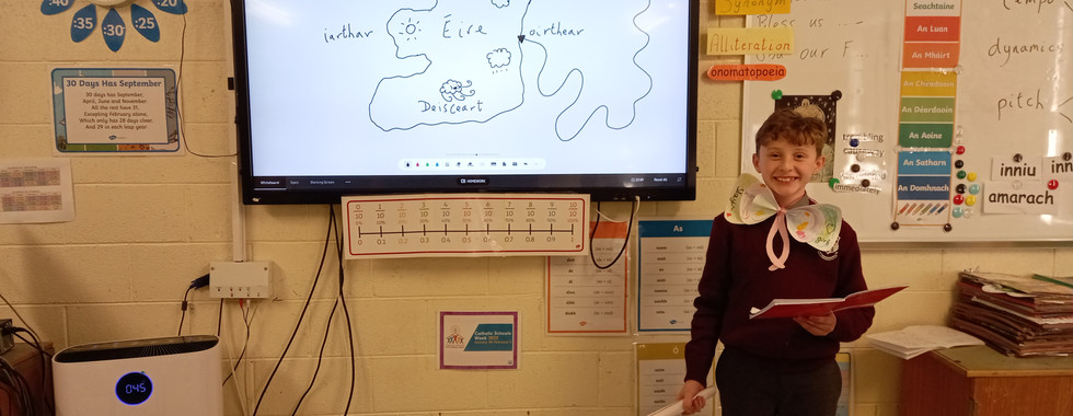 During 'Coicís na Gaeilge' the children took part in many fun activities including Irish dancing. The school had a 'Lá Glas' Day where everyone wore green to celebrate Saint Patrick's Day and we had a hot seat interview with Saint Patrick himself were we learned about his life.